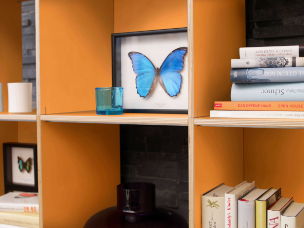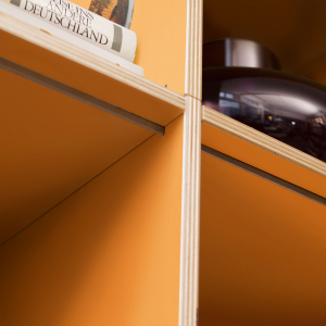So leicht und modern kann das Wohnregal Freiburg in der Farbauswahl Orange die Blicke auf sich ziehen. Im Kontrast zu dem groben Wandhintergrund wirken die schlanken, aber enorm robusten Seiten- und Bodenelemente sehr elegant.