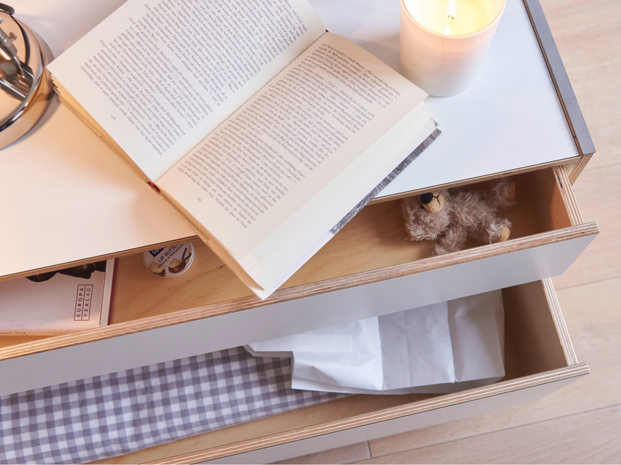 Nichts stört auf der Ablagefläche eines Nachttisches mehr, als zu viele Kabel. Die der Nachttischlampe und des Smartphones sollten den Platz auf Ihrem Nachtschrank nicht schmälern. Auf Wunsch fertigen wir deshalb individuelle Kabeldurchlässe an. Sogar in den Schubladen! So stört nichts das reduzierte Design Ihres Schlafzimmermöbels.